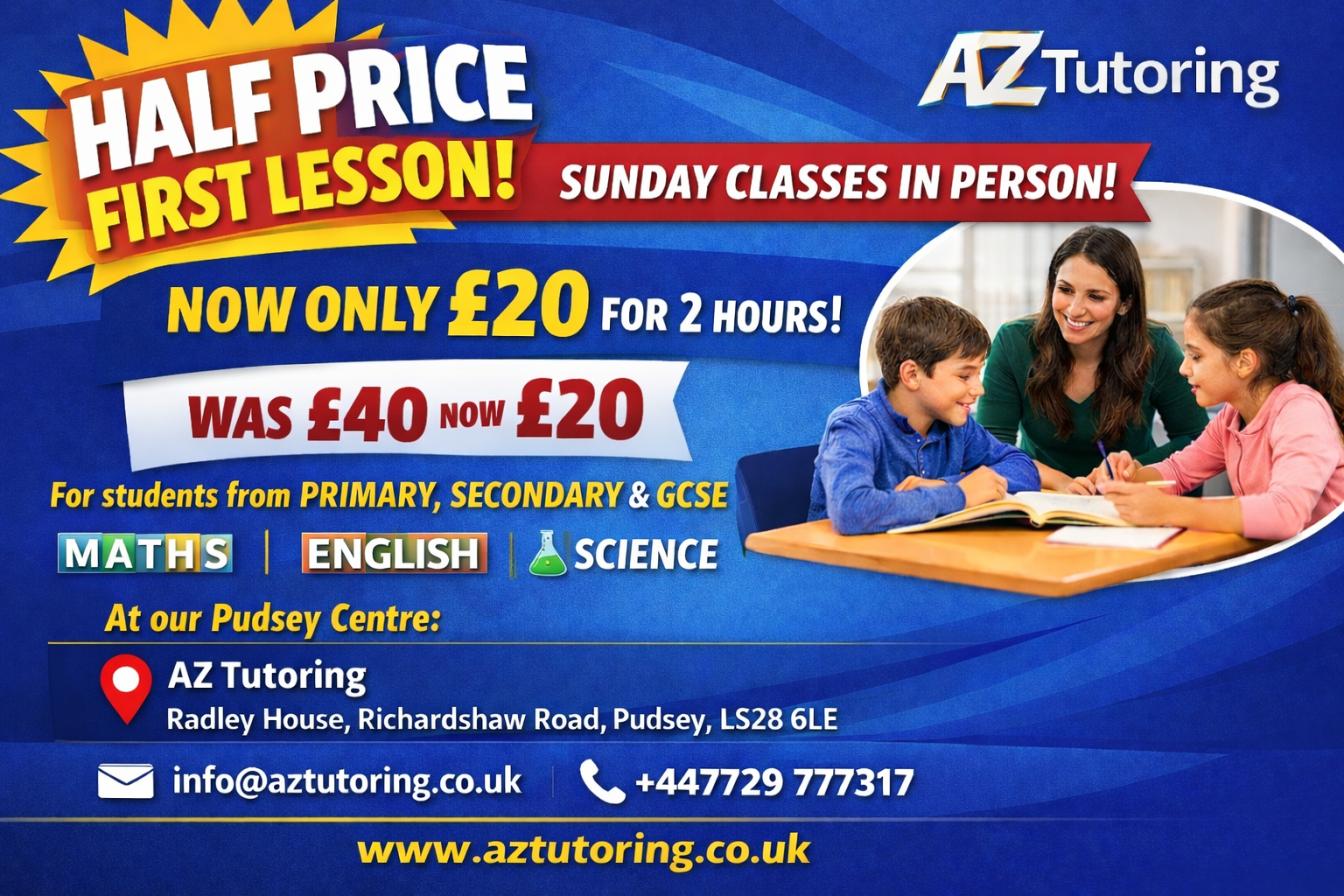Hi! Weβre AZ Tutoring, based in Leeds β helping students build confidence and achieve top grades with expert in-person tutoring tailored to their needs.